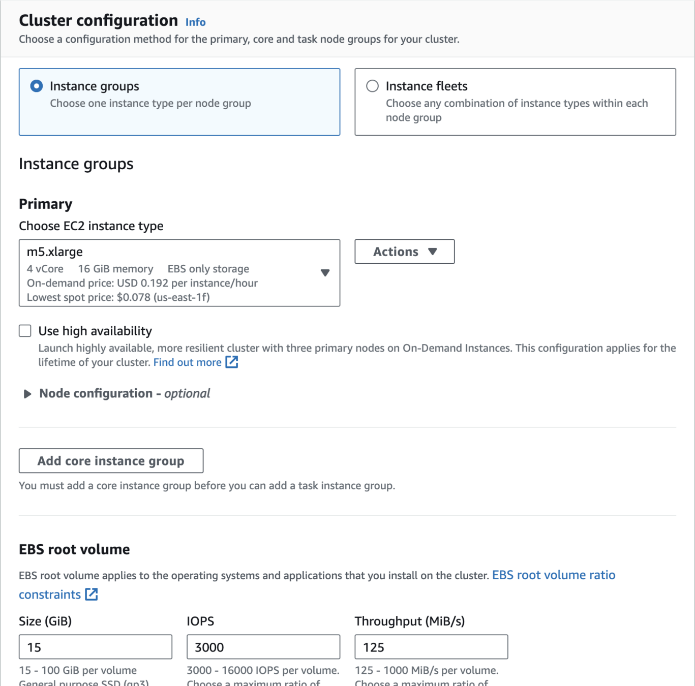 Create an Amazon EMR Cluster as follows - Cluster Configuration