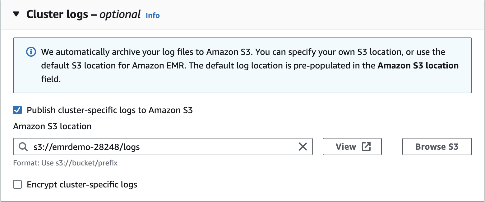 Create an Amazon EMR Cluster as follows - Cluster Logs