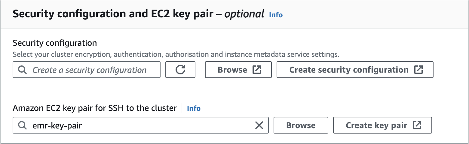 Create an Amazon EMR Cluster as follows - Security configuration and EC2 key pair