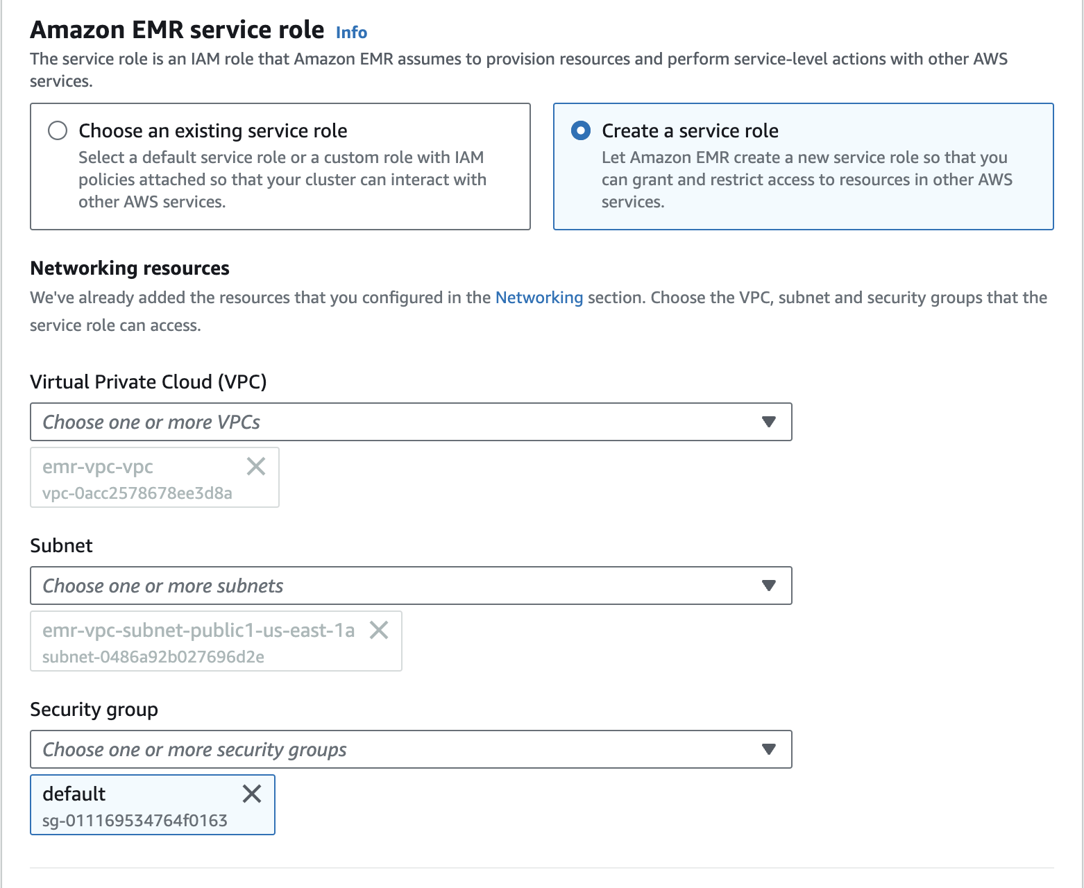 Create an Amazon EMR Cluster as follows - Amazon EMR service role