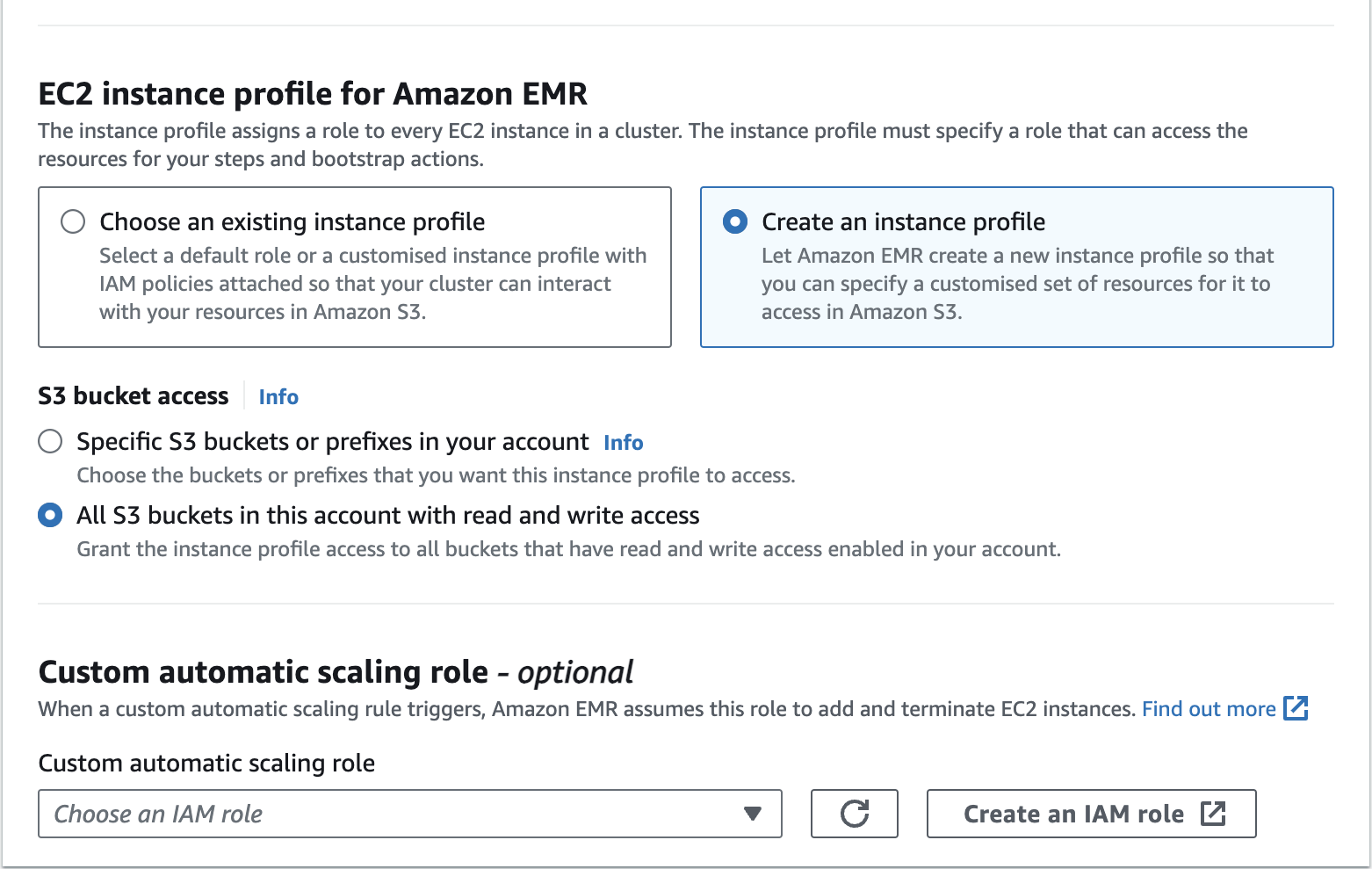 Create an Amazon EMR Cluster as follows - EC2 instance profile for Amazon EMR