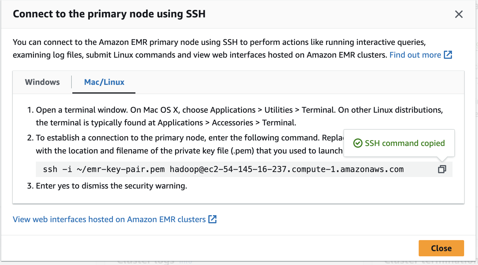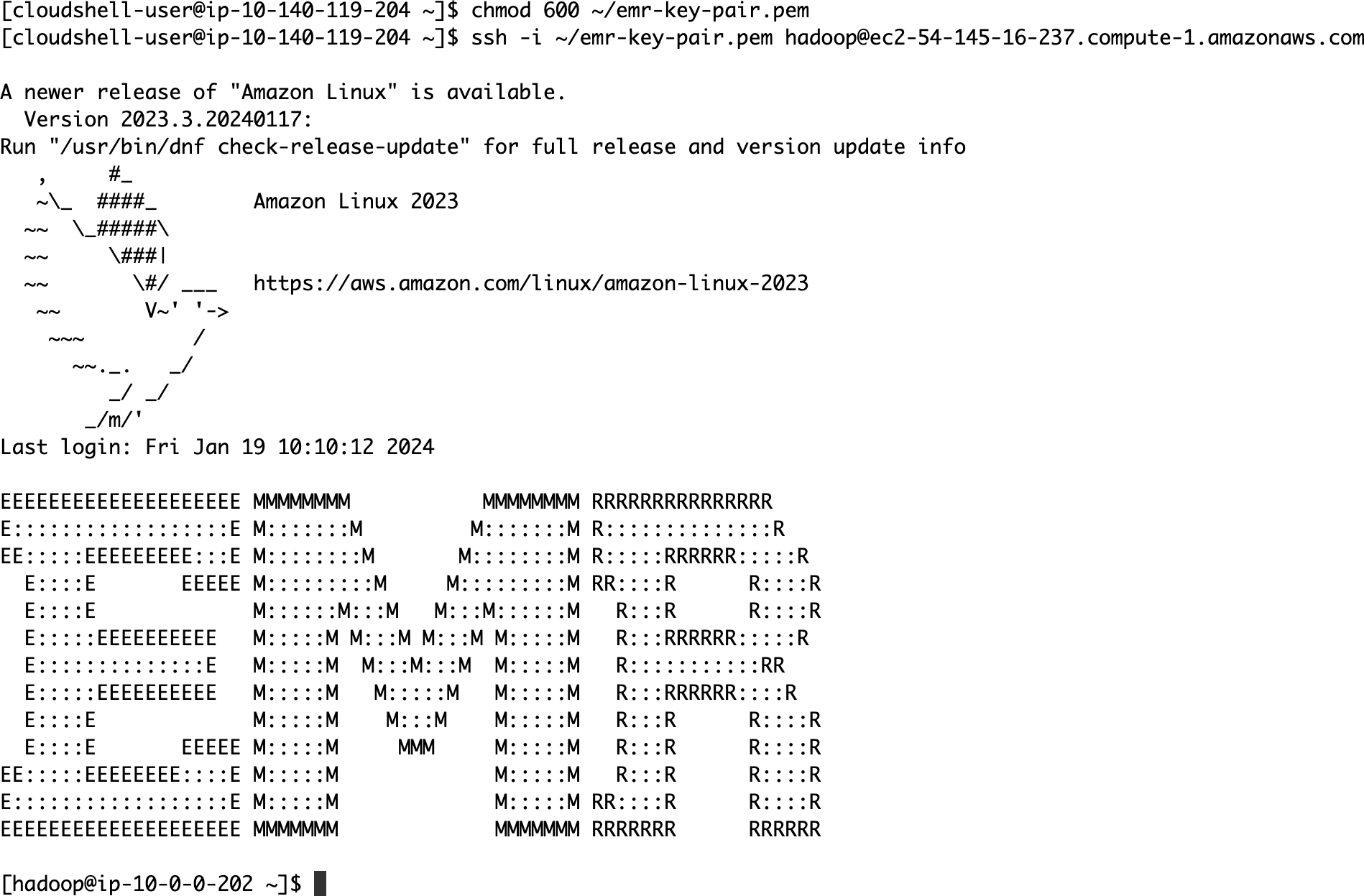 chmod 600 ~/emr-key-pair.pemssh -i ~/emr-key-pair.pem hadoop@ec2-54-145-16-237.compute-1.amazonaws.com