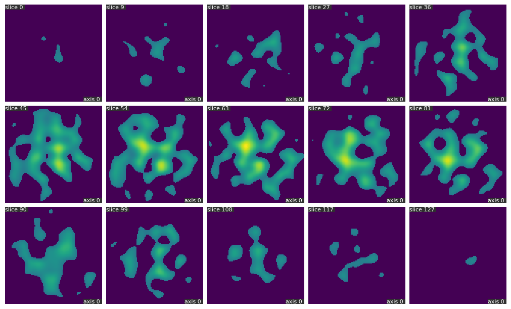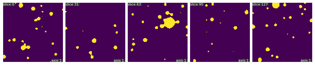 qim3d.viz.slices(binary, axis=1)labeled_volume, num_labels = qim3d.processing.operations.watershed(binary)
