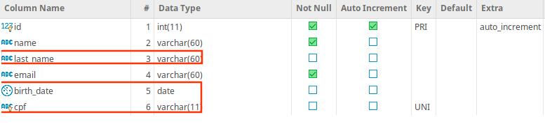 MANHÃ: adicionar um campo que represente a Data de Nascimento e outro que represente o CPF