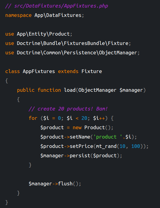$ composer require --dev doctrine/doctrine-fixtures-bundle