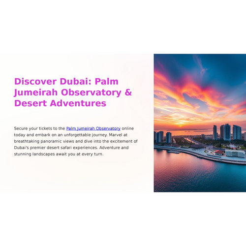 The <a href="https://dubaideserttsafari.com/dubai-palm-jumeirah-observatory/">Palm Jumeirah Observatory</a> in Dubai offers breathtaking panoramic views of the iconic palm-shaped island, the Arabian Gulf, and Dubai’s skyline. Located in The View at The Palm, 240 meters above ground, it features indoor and outdoor viewing decks, interactive exhibits, and immersive experiences. This stunning destination combines modern architecture with cutting-edge technology, providing visitors with a unique perspective of one of the world’s most ambitious man-made islands.