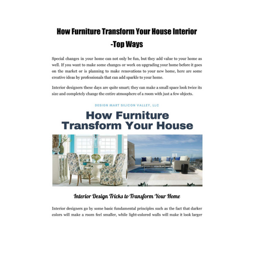 Companies such as Design Mart serve all interior designer needs as per their specifications. They have strikingly amazing furniture and art accessories from different high-end manufacturers. For buying Upholstery Furniture in California and Upholstery Showroom in Silicon Valley. For more details visit - https://www.designmartsv.com/product-category/custom-upholstered-furniture/ Contact Details: Design Mart Silicon Valley, LLC 23 Las Colinas Lane, Suite 104 San Jose, California 95119 United States Phone: +1 408-229-6500 Fax: 408.229.0400 Website: https://www.designmartsv.com https://www.facebook.com/pg/DesignMartSiliconValley/