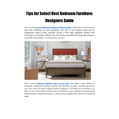 Companies like Design Mart SV, is one of the best Furniture stores for Architects and Interior Accessories Store. Here, the professionals provide you with some creative design tips that you can easily follow to transform your home. Design Mart SV welcomes Interior Design Professionals to check their collection as they offer the most precious & luxury bedroom furniture brands they can choose for their room decor and interior designs. Contact Details: Design Mart Silicon Valley, LLC 23 Las Colinas Lane, Suite 104 San Jose, California 95119 United States Phone: +1 408-229-6500 Fax: 408.229.0400 https://www.facebook.com/pg/DesignMartSiliconValley/ Website: https://www.designmartsv.com