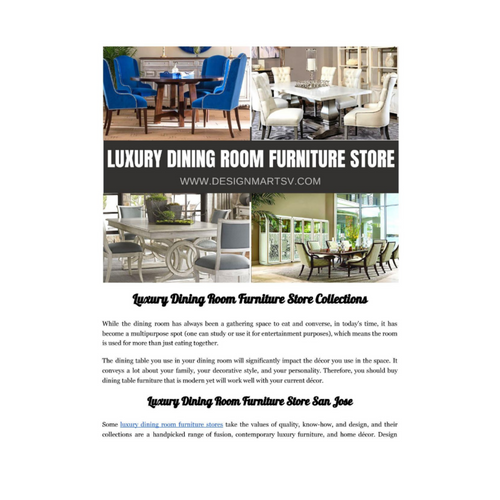 Some luxury dining room furniture stores take the values of quality, know-how, and design, and their collections are a handpicked range of fusion, contemporary luxury furniture, and home décor. Design Mart is one such premium dining room furniture store in San Jose, which always creates new furniture, with exclusive materials, mechanisms, and structures. For more information visit - https://www.designmartsv.com/product-category/dining/