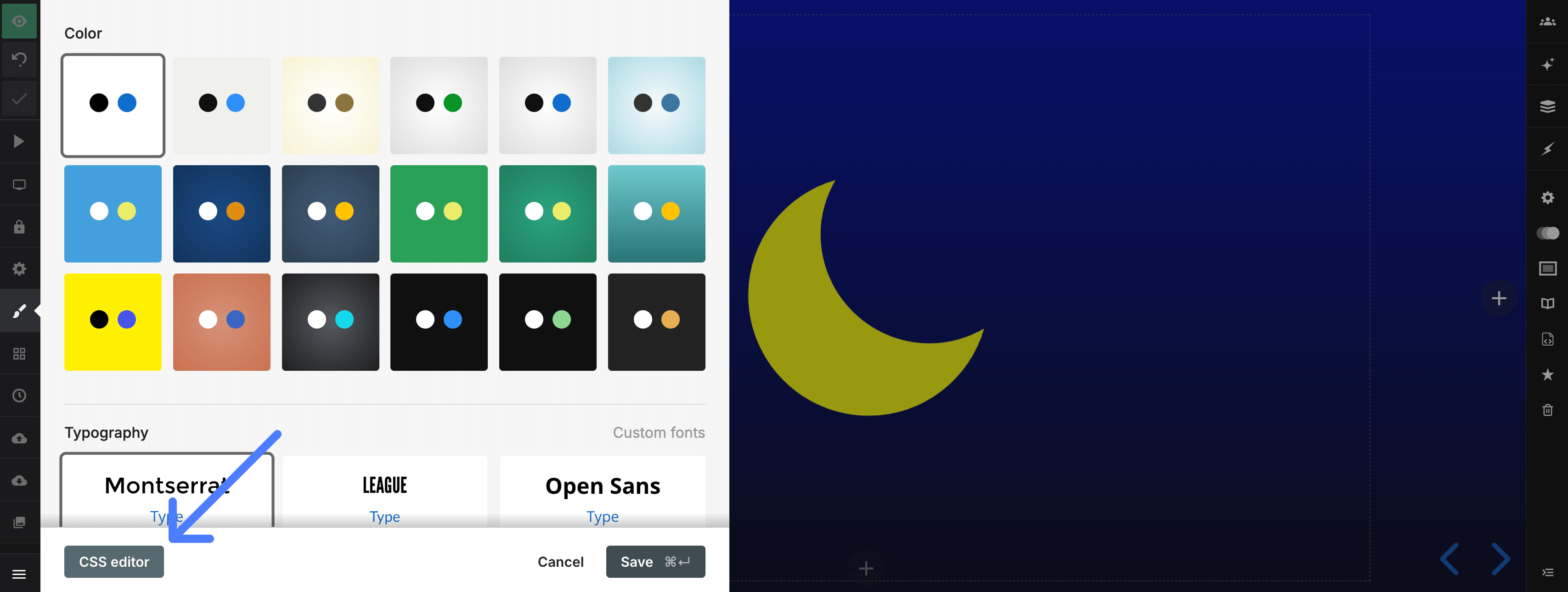 The CSS editor lets you author custom styles for your presentation with a real-time preview of the result. It's available as an option inside of the Style panel of the presentation editor.