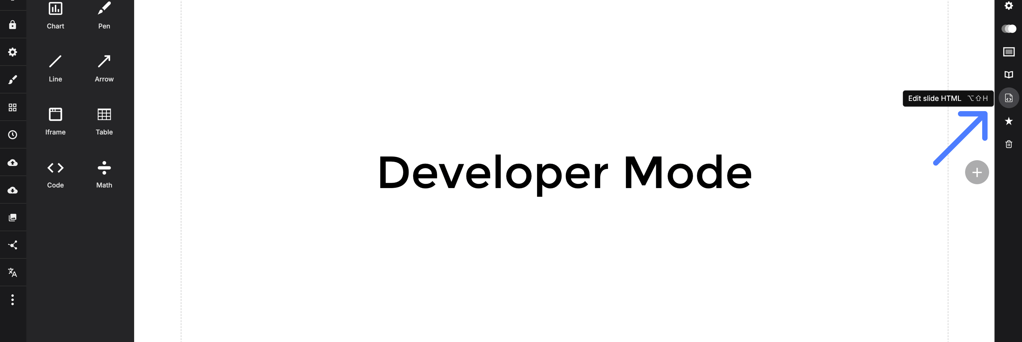 We strive to make Slides a great and flexible tool for developers. Presentations created on Slides are HTML documents under the hood, so generally anything that HTML can do, Slides can do. We make it easy to access and edit the underlying HTML and CSS through the Developer Mode.