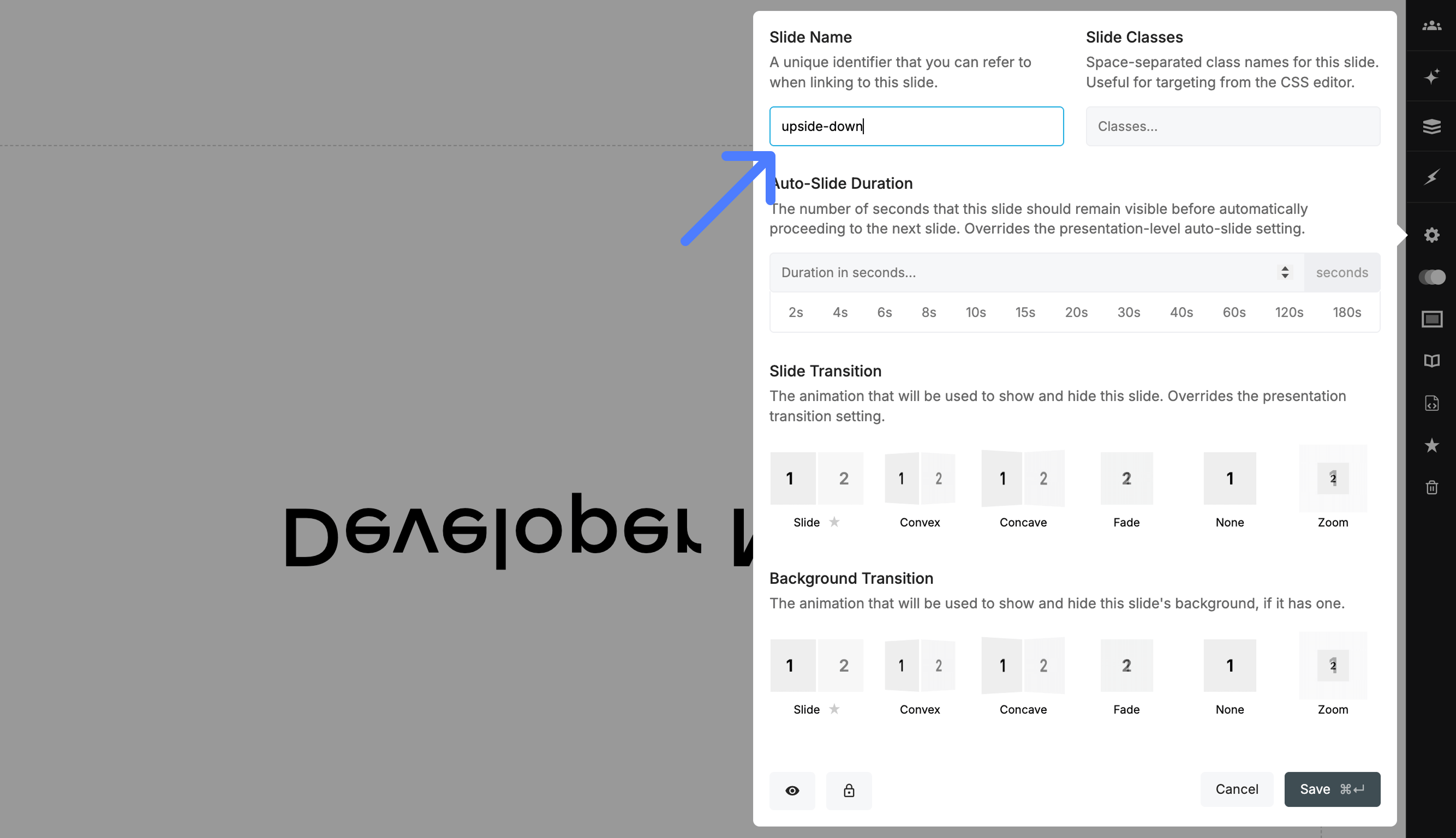 Just like you can add custom classes to individual elements it's also possible to add custom classes at the slide level. This can used to apply broader changes to the whole slide like inverting text and icon colors or changing the slide transition.
