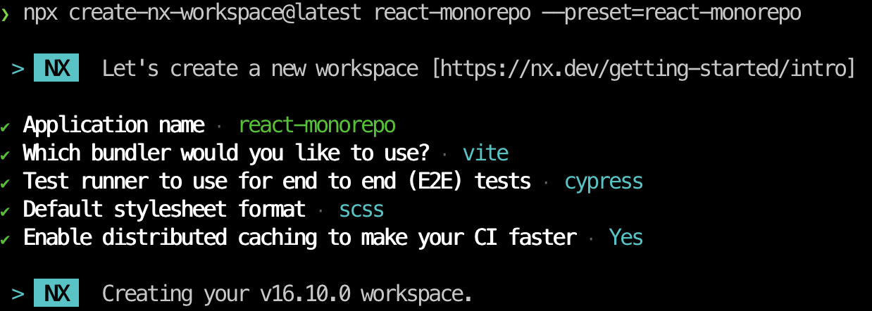 npm install --global nx@latestnpx create-nx-workspace@latest react-monorepo --preset=react-monorepoInstall Nx CLI globally