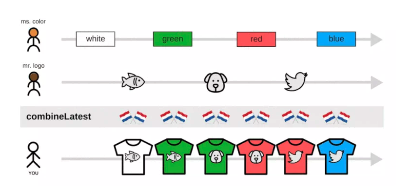 -CombineLast: emits any time a new value is emitted from any of the sources them