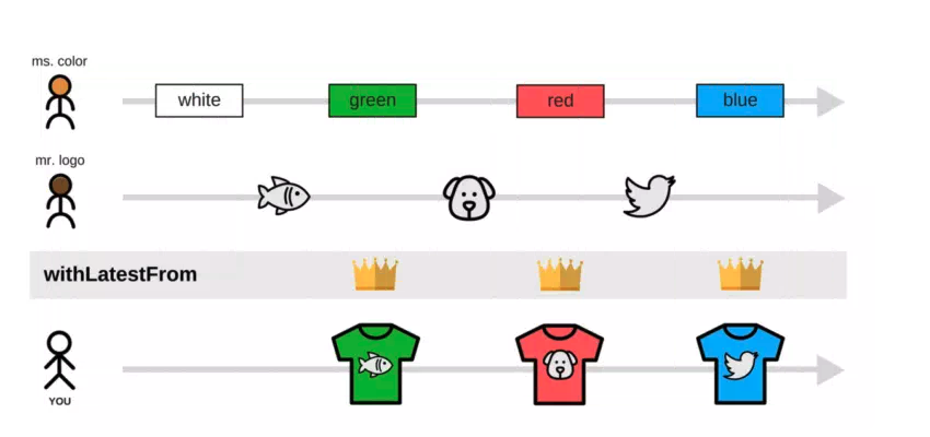 -LatestFrom: emits any time a new value is emitted from the source stream
