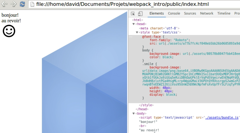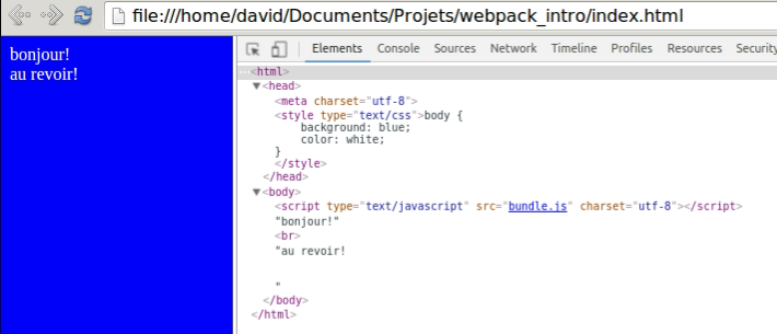 document.write(module1.auRevoir());Nous modifions ensuite entry.js pour y ajouter le require de notre style.css qui aura pour effet de l'inclure dans notre bundle en tant que module: