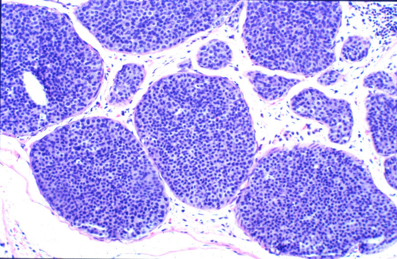 Histology shows distended lobules with neoplastic cells without BM penetration