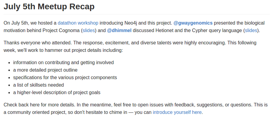 This presentation introduces Hetionet and Neo4j for the datathon workshop organized by the DataPhilly and Code for Philly meetups on July 5, 2016. At the end, we introduce Project Cognoma, which will be the focus of future hack nights.