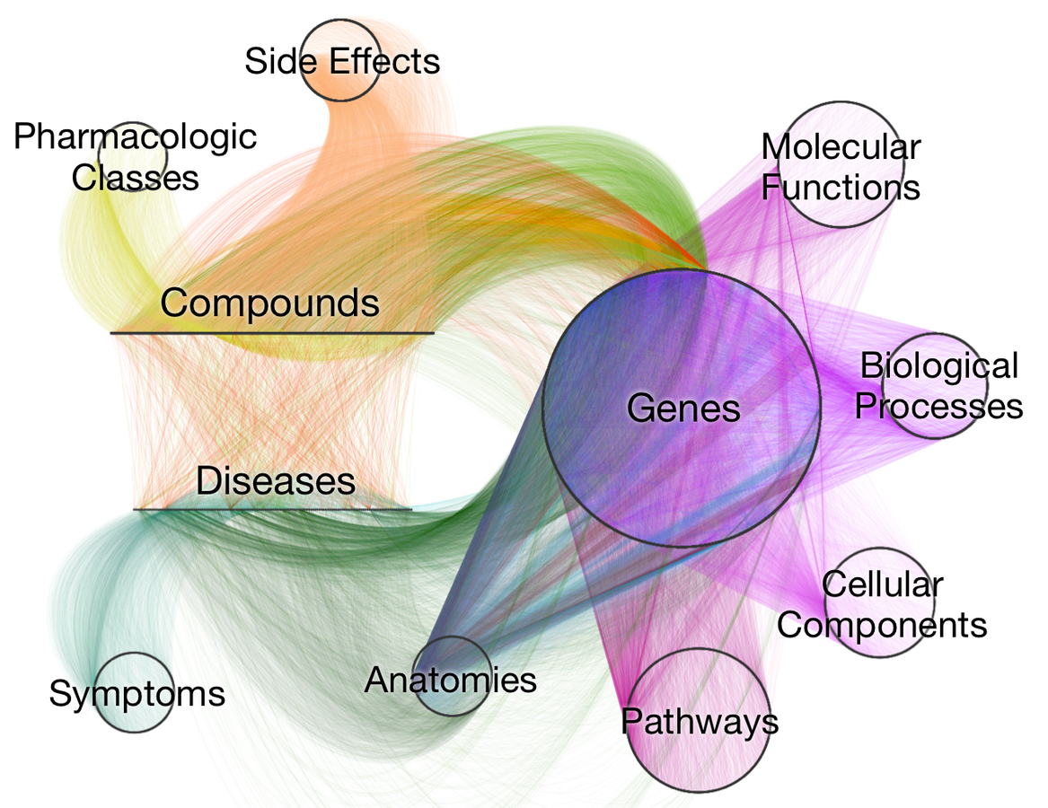 Approaches in network medicine have traditionally focused on generating insights from graphs with a single type of node and relationship. However, biology's complexity demands a richer network structure capable of integrating diverse, multi-scale information. Towards this end, we develop hetnets — networks with multiple types of nodes and relationships.