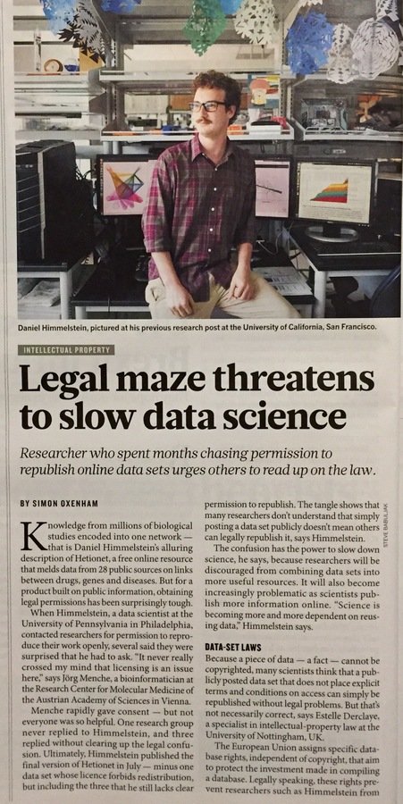 Going forward, we're investigating more efficient algorithms for feature extraction on hetnets. In addition, we're looking to automate hetnet construction by text mining the literature. The success of hetnets will depend on the availability of openly licensed inputs. As such, I'll briefly discuss data analyses I've performed in hopes of making science more open.