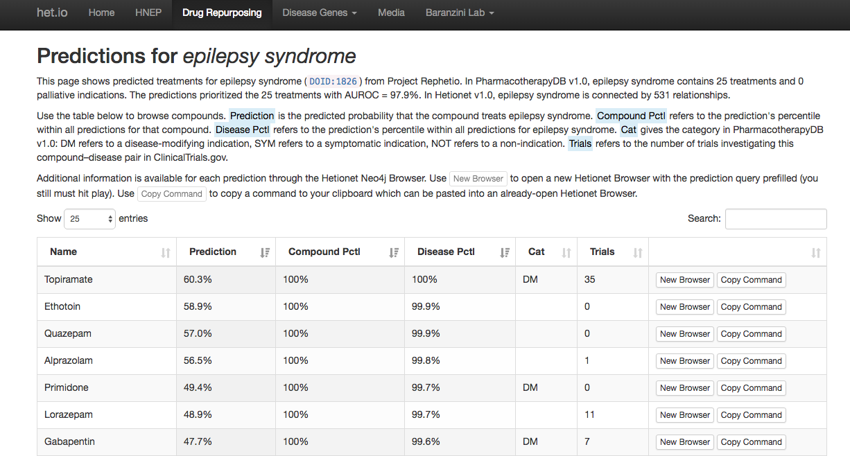 In Project Rephetio, we applied Hetionet to predict new uses for existing drugs. Our approach learned the network patterns of connectivity that differentiate treatments from non-treatments, enabling us to predict the probability of treatment for 209,168 compound–disease pairs. These predictions prioritize treatments under investigation by clinical trial.