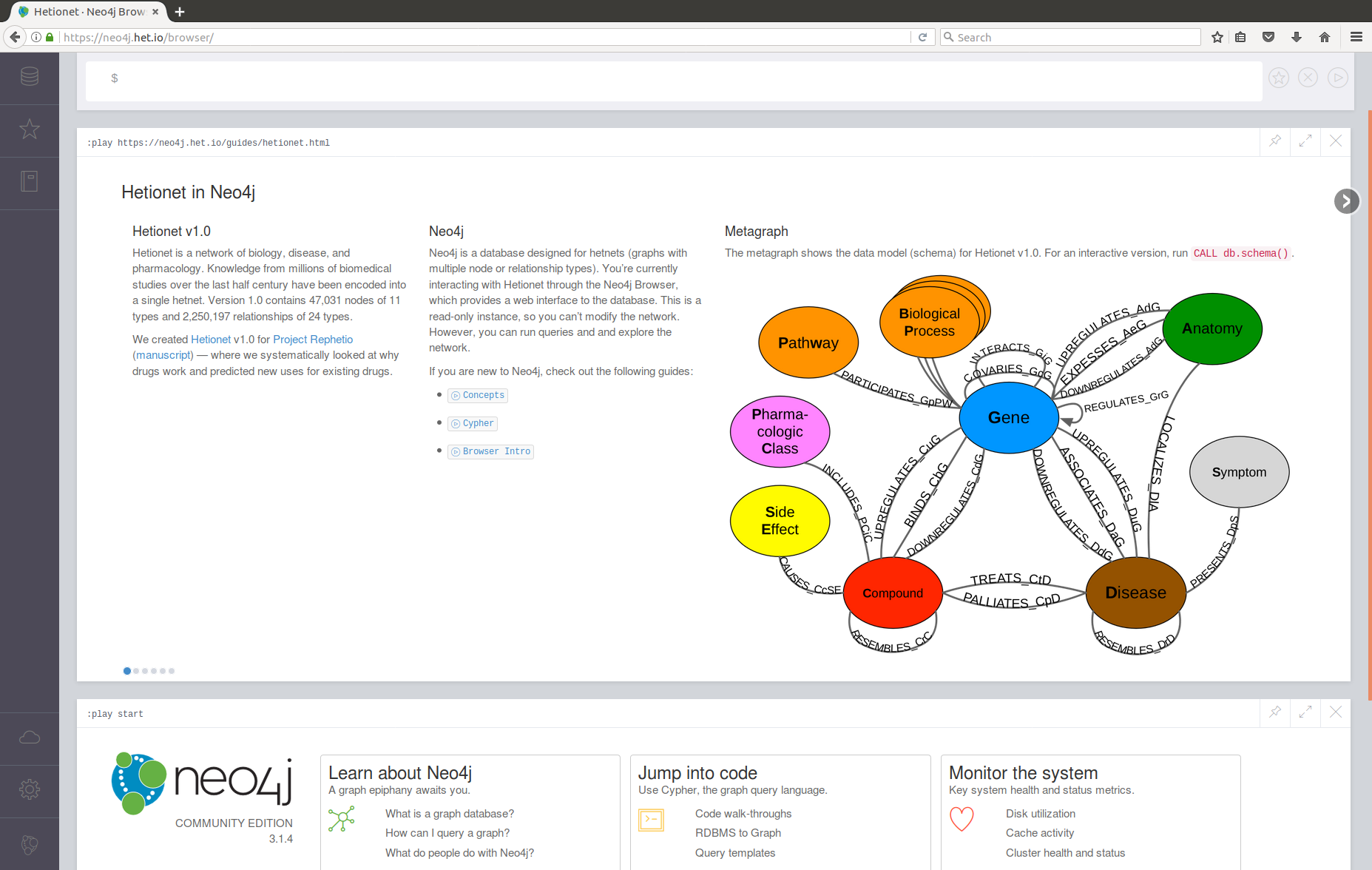 Specifically we created Hetionet — a network of biology, disease, and pharmacology. This resource encodes knowledge from millions of biomedical studies over the last half century. Version 1.0 contains 47,031 nodes of 11 types and 2,250,197 relationships of 24 types. We host a public Neo4j database instance at https://neo4j.het.io allowing users to interact with Hetionet.