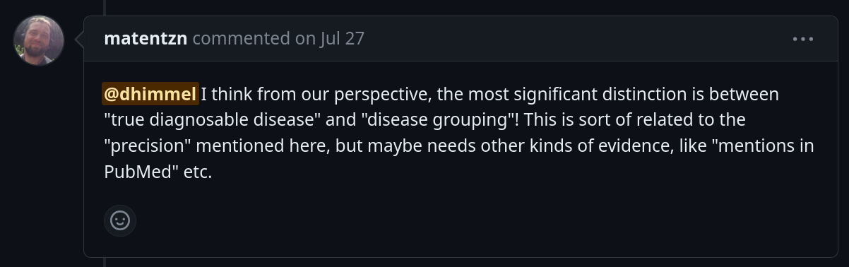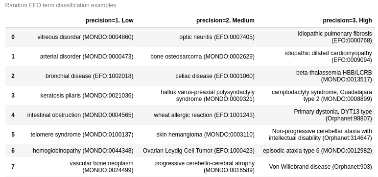 - `low`: Low precision terms are the ontological ancestors of both `medium` and `high` precision terms, group collections of diseases with *some* shared characteristics and typically connote a relatively heterogenous patient population. They are often terms used within the ontology for organizational purposes.
