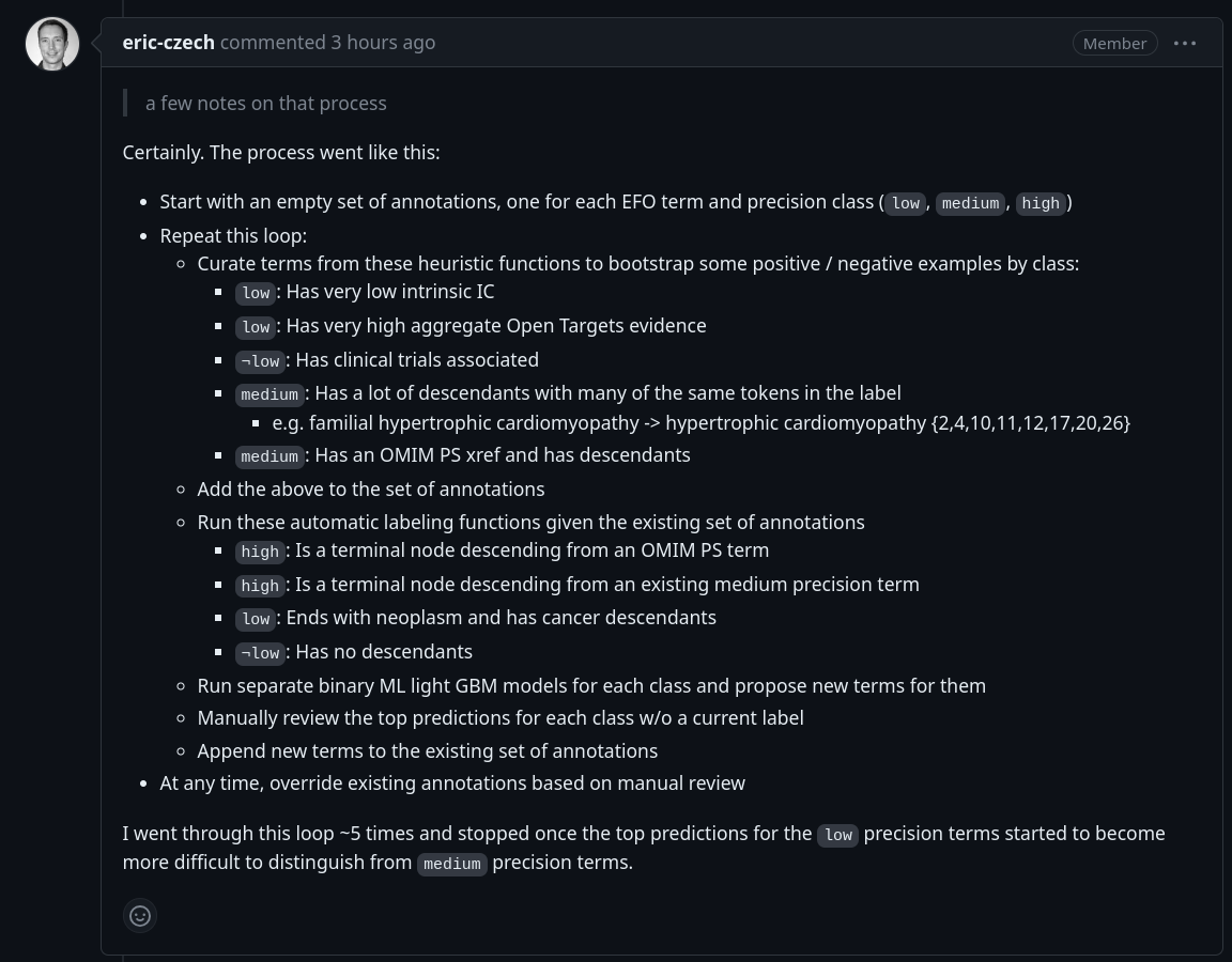 - `medium`: Medium precision terms are the ontological ancestors of `high` precision terms (if any are known), often include indications in later stage clinical trials and generally reflect groups of patients assumed to be suffering from a condition with a shared, or at least similar, physiological or environmental origin.