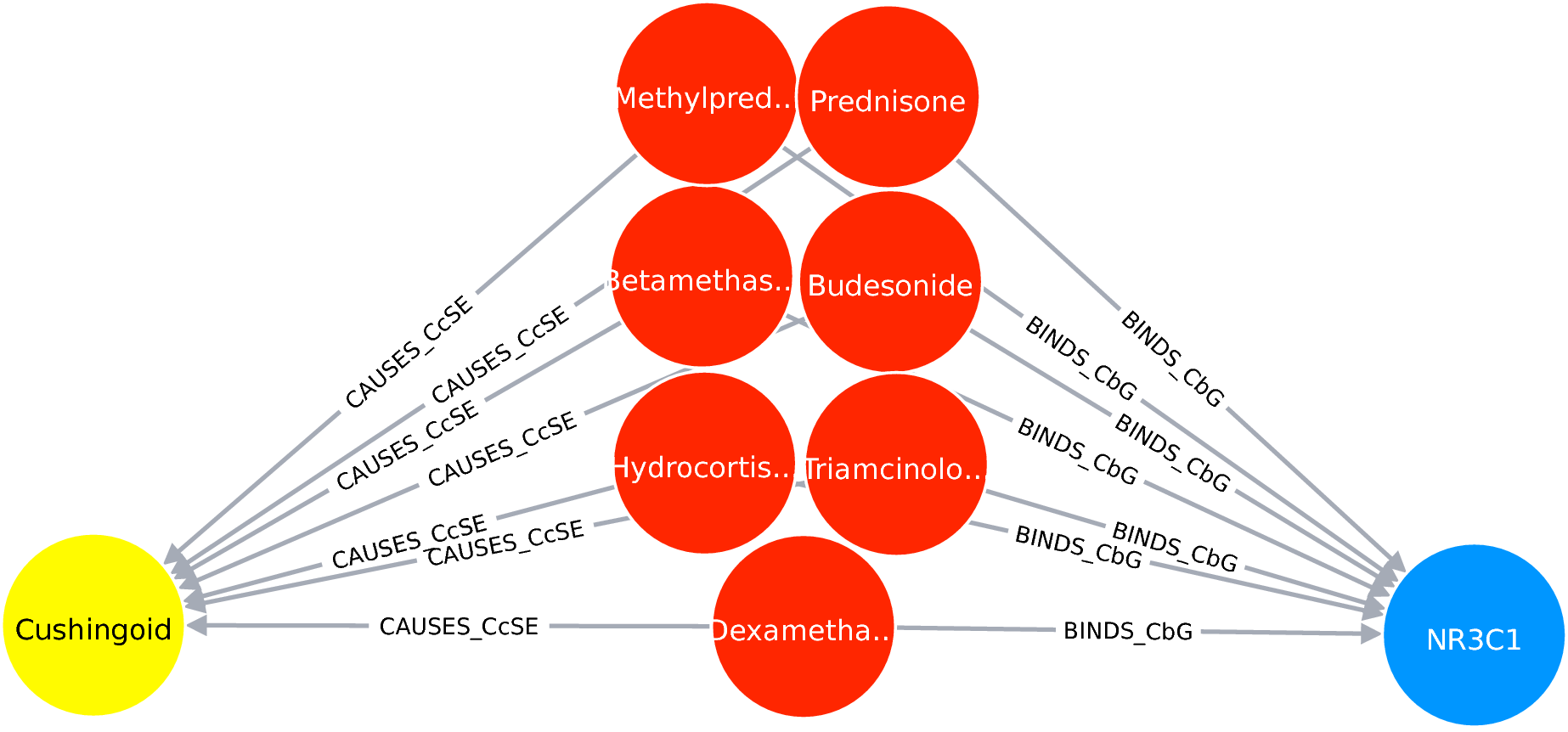 Compound–causes–SideEffect–causes–Compound–treats–Disease