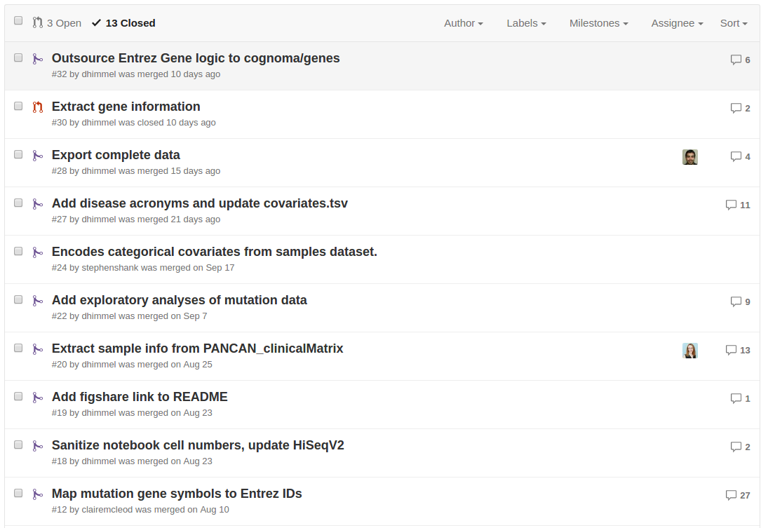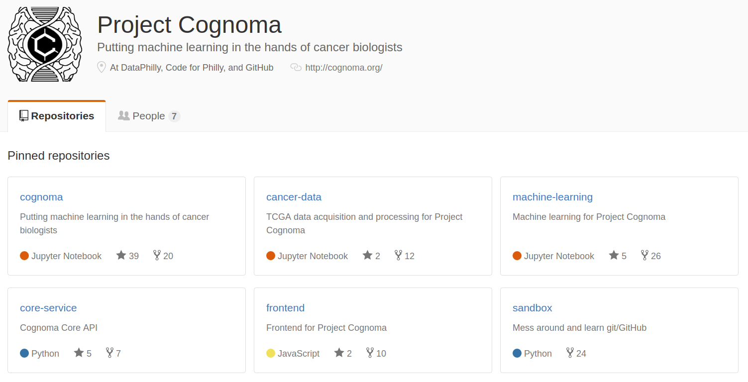 Cognoma is an open-source/citizen-science philanthropy being developed as a collaboration between the Greene Lab at Penn and the DataPhilly and Code for Philly meetups. This arrangement leverages the collective fullstack expertise of our diverse contributor base. Hitherto, hundreds of individuals have attended Cognoma meetups, and more than fifty have gotten involved on GitHub. Our priorities are everyone learns something new and putting machine learning in the hands of cancer biologists.