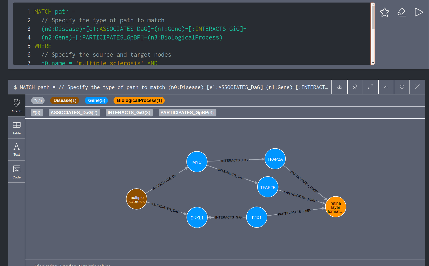 MATCH path = (source:Disease)-[*..2]-(target:BiologicalProcess)