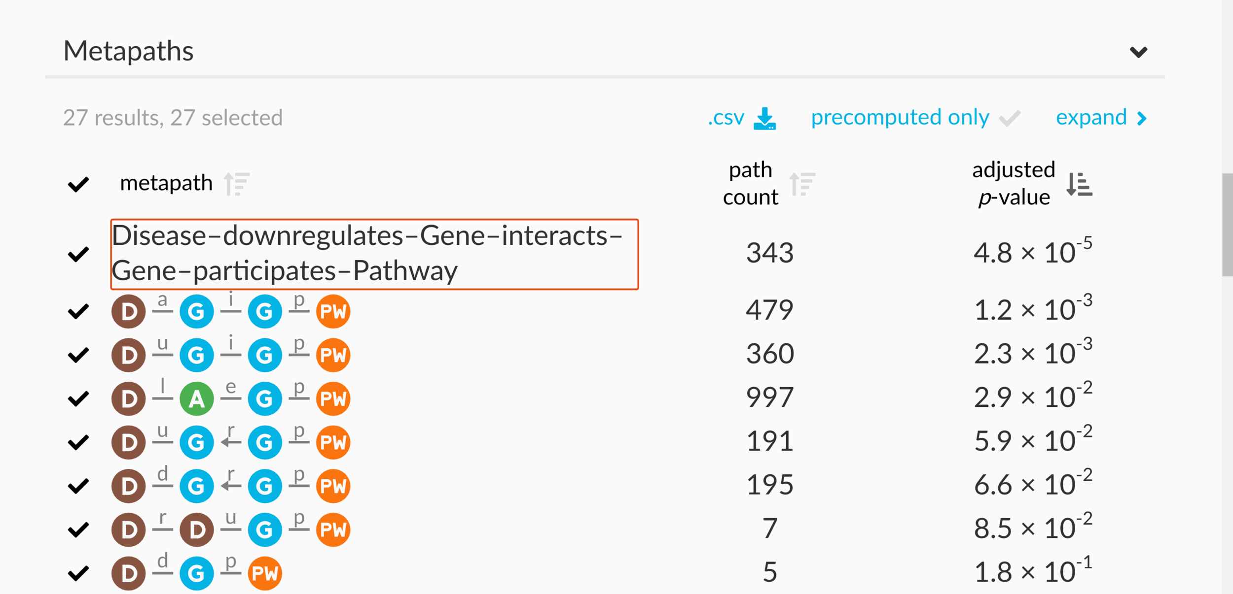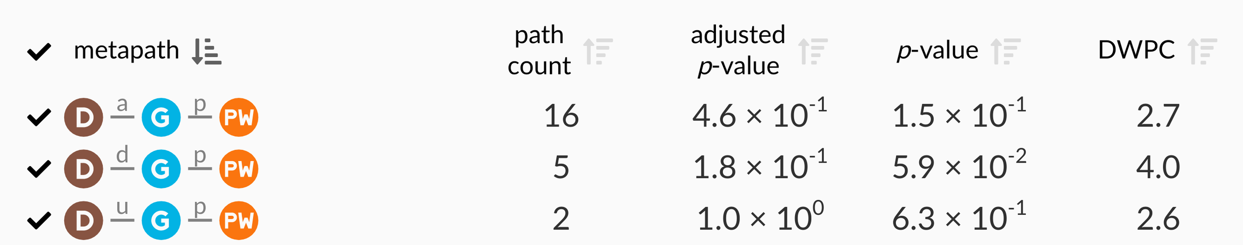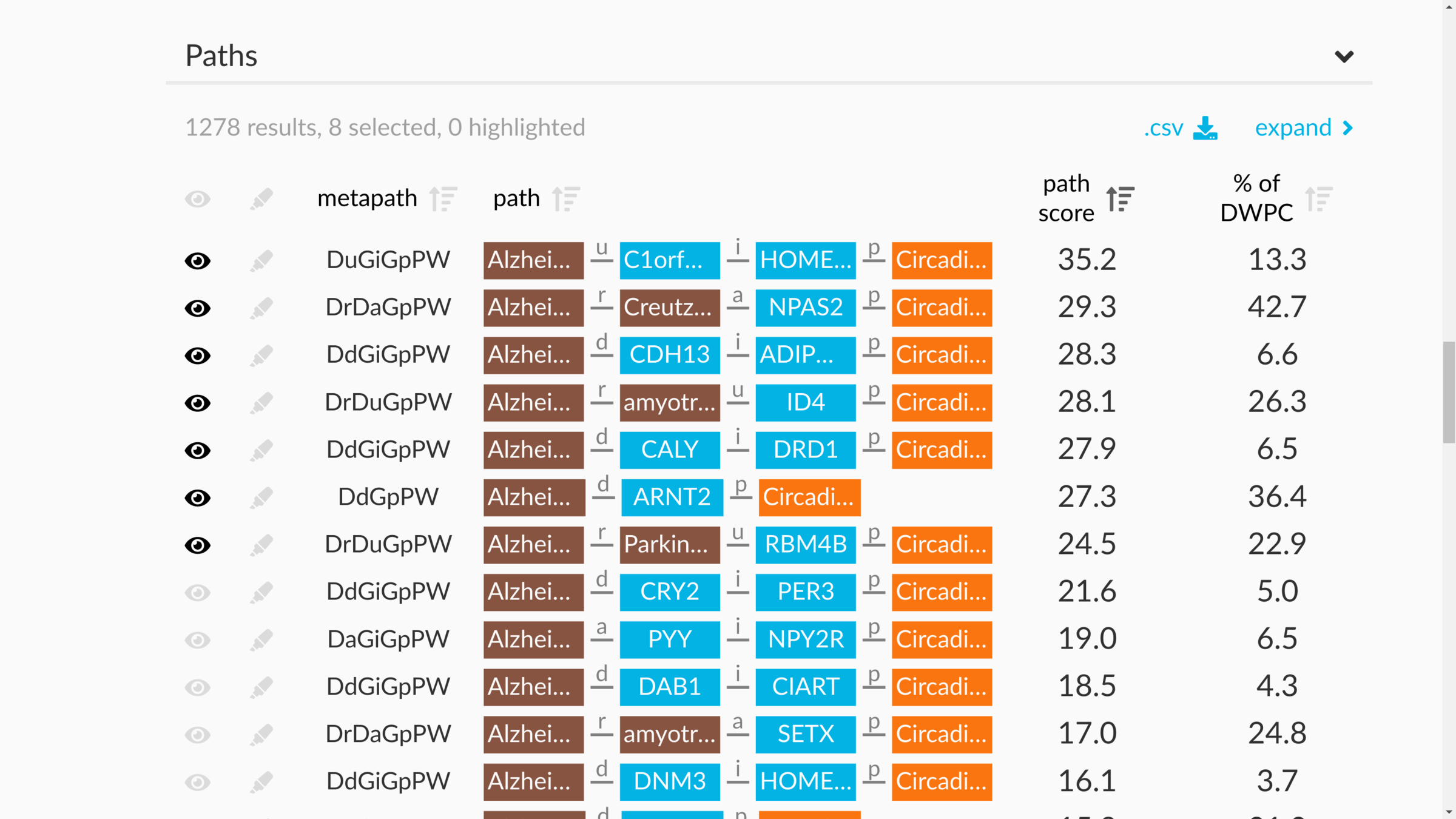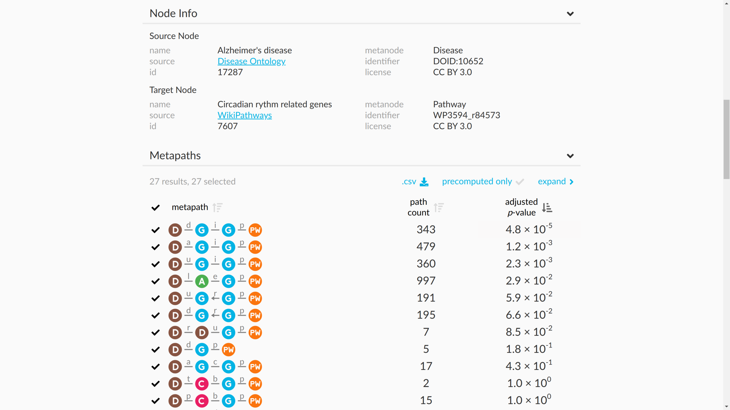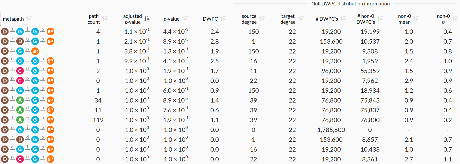 DWPC — Measures the extent of connectivity between the source and target node for the given metapath. Like the path count, but with less weight given to paths along high-degree nodes.