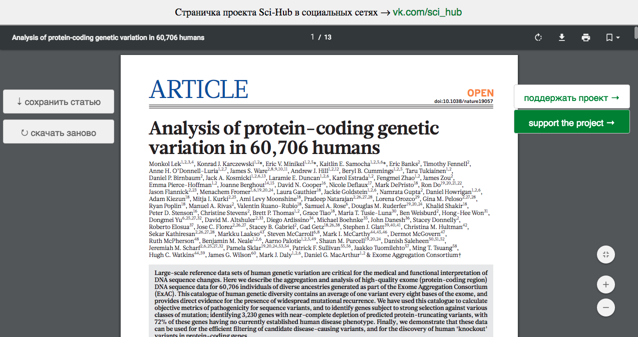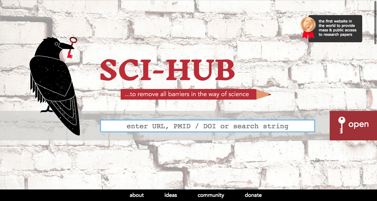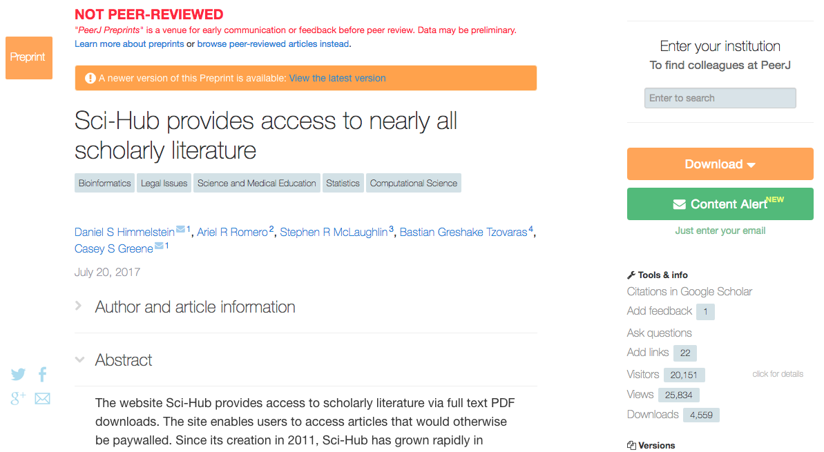 Himmelstein DS, Romero AR, McLaughlin SR, Greshake Tzovaras B, Greene CS. (2017) Sci-Hub provides access to nearly all scholarly literature. PeerJ Preprints DOI: 10.7287/peerj.preprints.3100