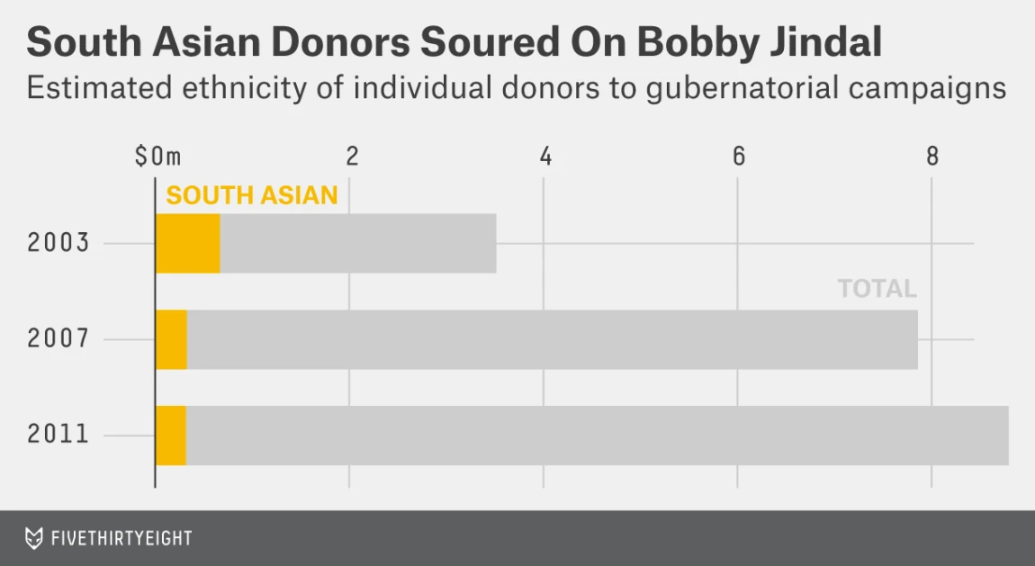 During Jindal’s first gubernatorial campaign, in 2003, South Asian-Americans donated an estimated $667,000, or 19 percent of the $3.5 million he raised from individual donations.