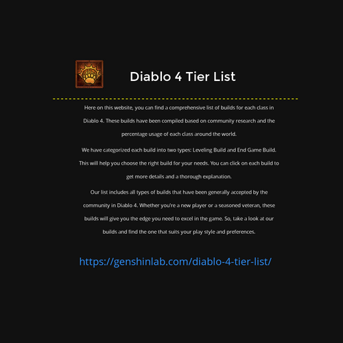 Here on this website, you can find a comprehensive list of builds for each class in Diablo 4. Take a look at our builds and find the one that suits your play style and preferences. https://genshinlab.com/diablo-4-tier-list/