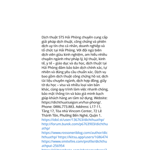 Website: https://dichthuatsaigon.vn/hai-phong/https://dichthuatsaigon.vn/hai-phong/ Dịch thuật STS Hải Phòng chuyên cung cấp giải pháp dịch thuật, công chứng và phiên dịch uy tín cho cá nhân, doanh nghiệp và tổ chức tại Hải Phòng. Với đội ngũ biên dịch viên giàu kinh nghiệm, am hiểu nh