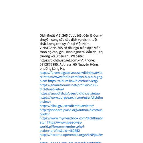 Website: https://dichthuatviet.com.vn/https://dichthuatviet.com.vn/ Dịch thuật Việt 365 được biết đến là đơn vị phân phối các dịch vụ dịch thuật chất lượng cao uy tín tại Việt Nam. VINATRANS 365 sở hữu đội ngũ biên dịch viên có chuyên môn cao, giàu kinh nghiệm, dẫn đầu thị trườ