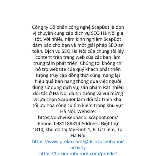 Website: https://dichvuseohanoi.scapbot.com/ ScapBot JSC là doanh nghiệp cung cấp dịch vụ SEO Hà Nội giá tốt. Cùng hơn 10 năm làm SEO ScapBot khẳng định cho bạn về một phương pháp SEO ổn định. Dịch vụ SEO Hà Nội của chúng tôi lấy content trên trang w