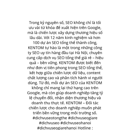 Website: https://dichvuwebsite.com.vn/dich-vu-seo-tong-the-gia-re-ha-noi-kentom/. Trong kỷ nguyên số, SEO không chỉ là tối ưu vài từ khóa để xuất hiện trên Google, mà là chiến lược xây dựng thương hiệu số lâu dài. Với 12 năm kinh nghiệm và hơn 100 dự