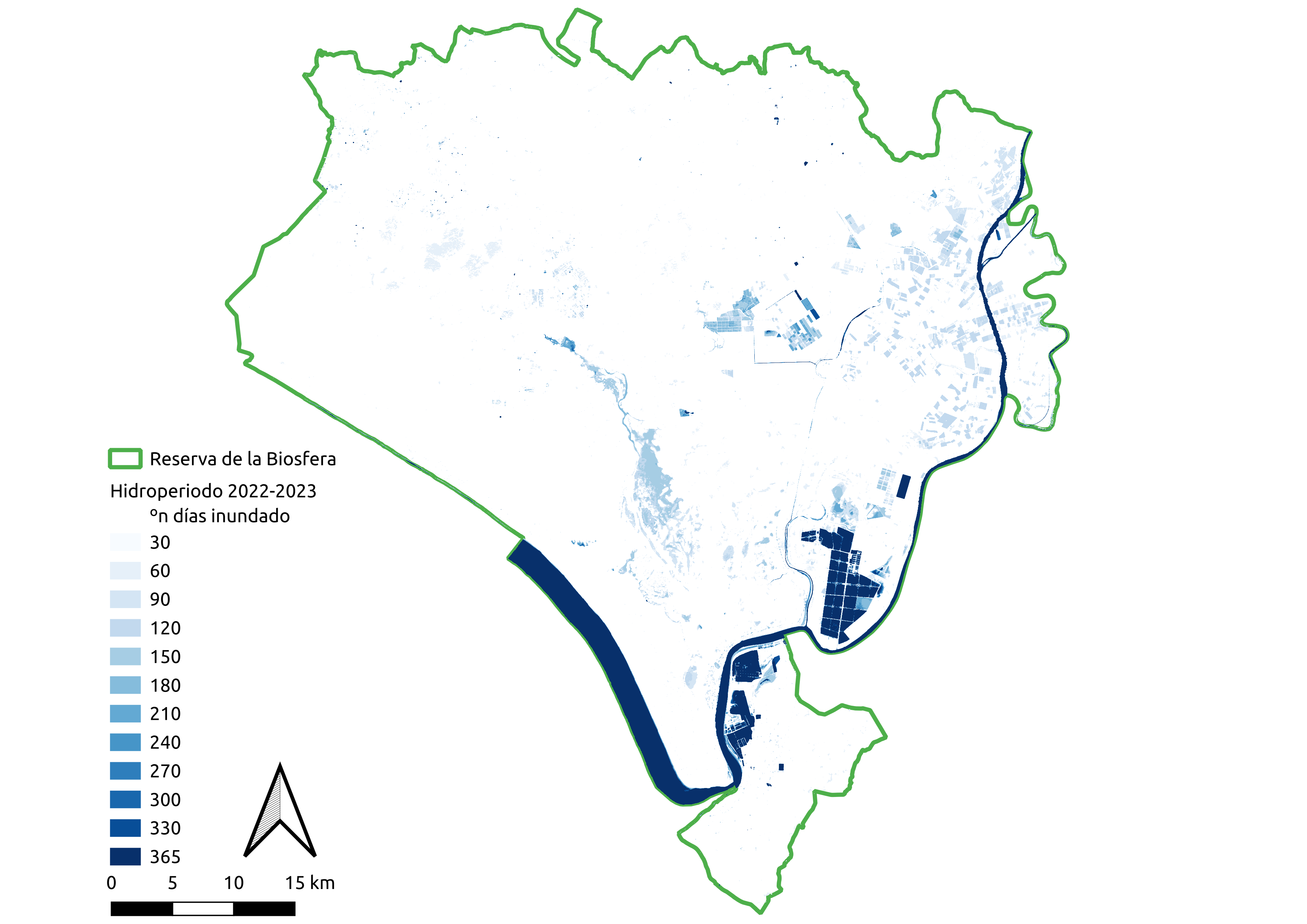 La obtención de máscaras de agua para cada escena Landsat entre 1984 y el presente, permite obtener una estimación del número de días que cada pizel ha estado inundado durante el ciclo hidrológico. Y una vez procesados todos los hidroperiodos, generar otra capa con la desviación de cada ciclo con respecto a la media de la serie histórica. Lo cual permite hacer un análisis de las tendencias en la inundación del Espacio Natural de Doñana.