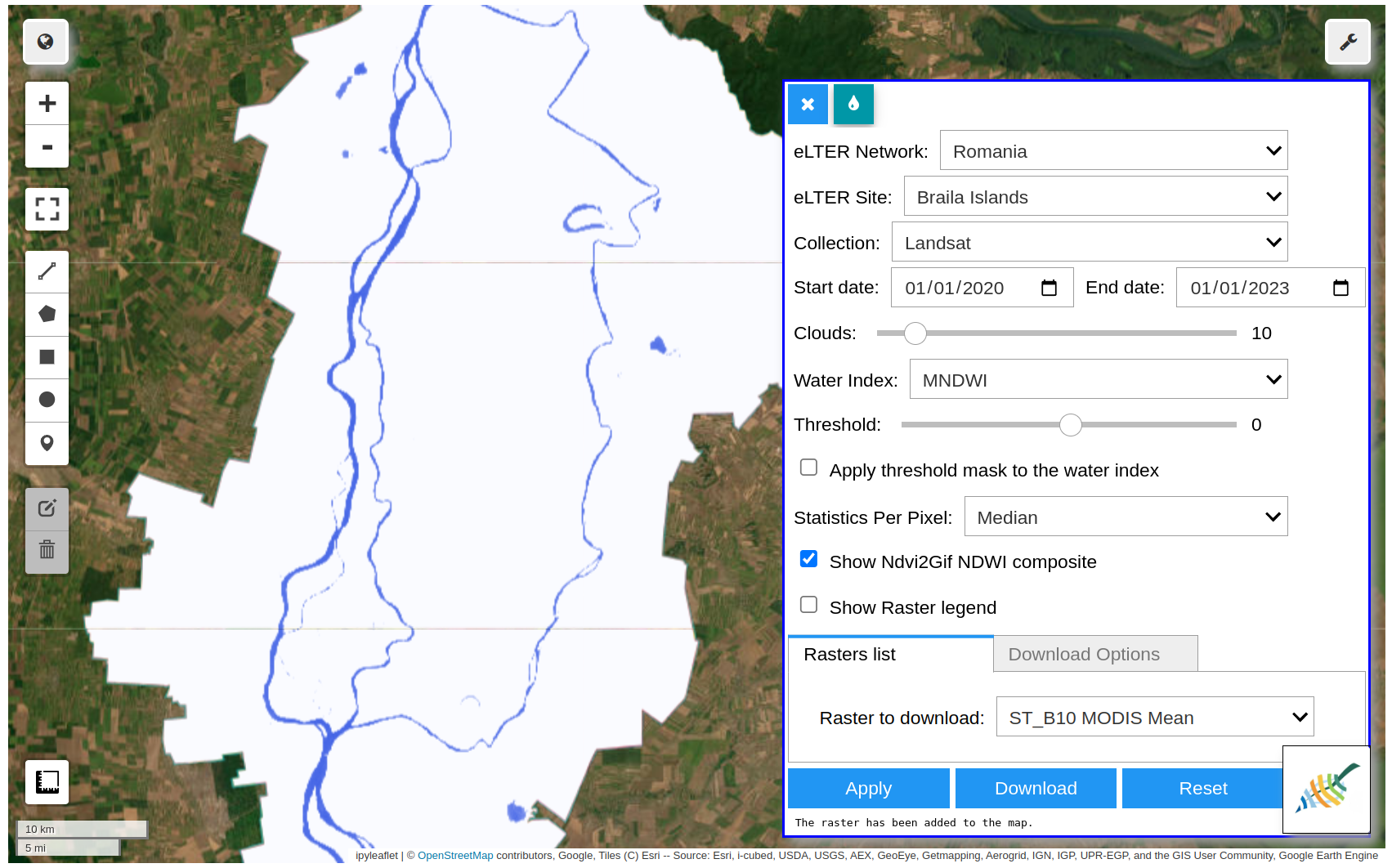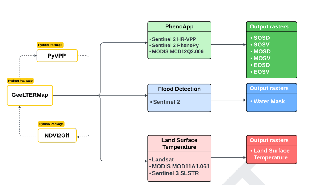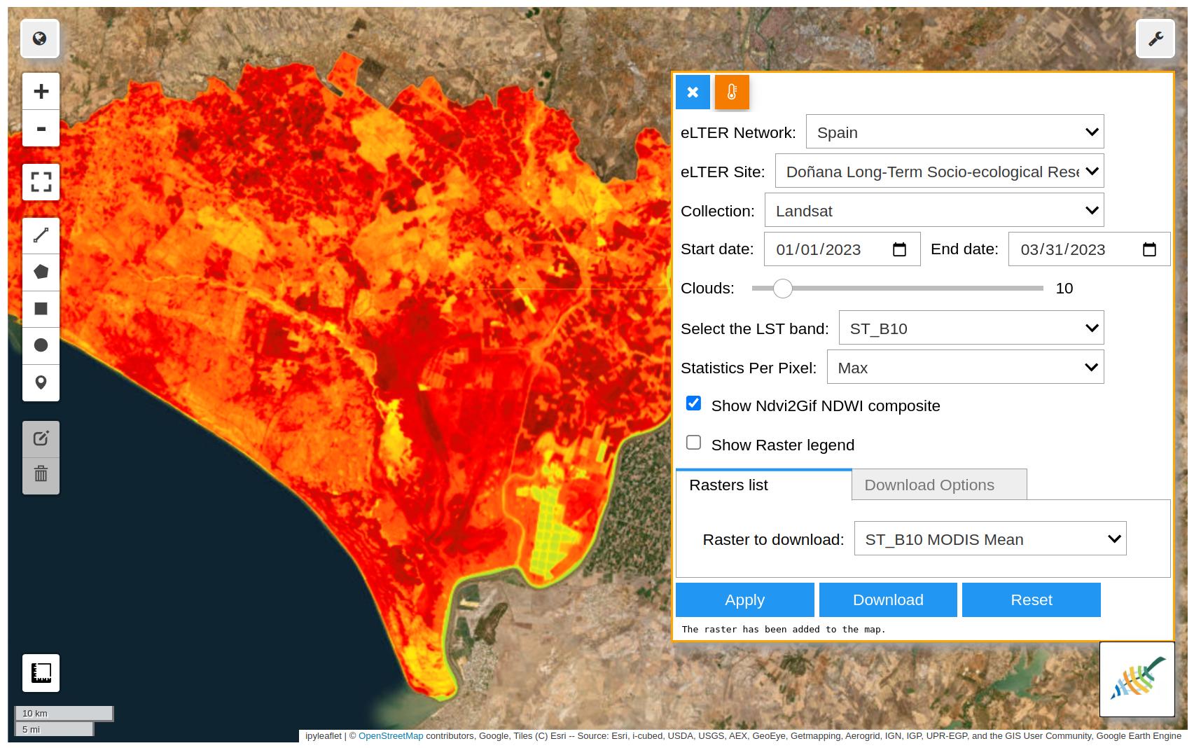 Aplicación basada en Google Earth Engine desarrollada dentro del Proyecto eLTER Plus para la visualización, análisis, consulta y validación de imágenes de Temperatura de Superficie, Inundación y Fenología en los sites de eLTER.