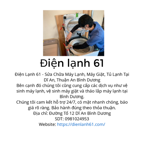 Điện Lạnh 61 - Sửa Chữa Máy Lạnh, Máy Giặt, Tủ Lạnh Tại Dĩ An, Thuận An Bình Dương Bên cạnh đó chúng tôi cũng cung cấp các dịch vụ như vệ sinh máy lạnh, vệ sinh máy giặt và tháo lắp máy lạnh tại Bình Dương. https://dienlanh61.com/