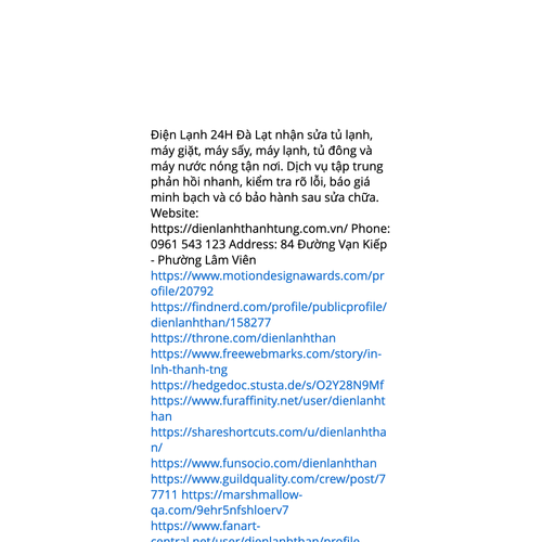 Website: https://dienlanhthanhtung.com.vn/ Điện Lạnh 24H Đà Lạt nhận sửa tủ lạnh, máy giặt, máy sấy, máy lạnh, tủ đông và máy nước nóng tận nơi. Dịch vụ tập trung phản hồi nhanh, kiểm tra rõ lỗi, báo giá minh bạch và có bảo hành sau sửa chữa. Phone: