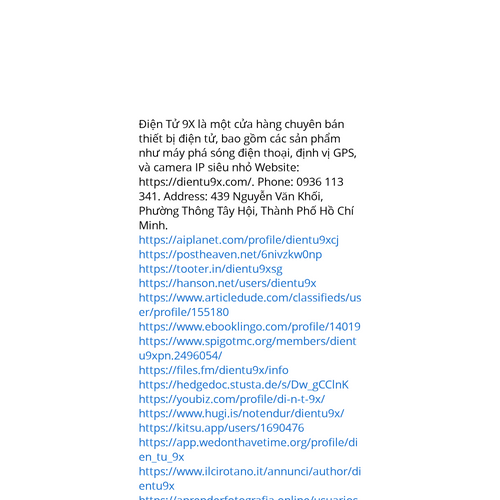 Website: https://dientu9x.com/https://dientu9x.com/ Điện Tử 9X là một cửa hàng chuyên bán thiết bị điện tử, bao gồm các sản phẩm như máy phá sóng điện thoại, định vị GPS, và camera IP siêu nhỏ Phone: 0936 113 341. Address: 439 Nguyễn Văn Khối, Phường Thông Tây Hội, Thà