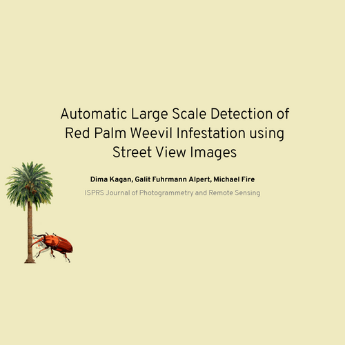 - Dima Kagan, Galit Fuhrmann Alpert, and Michael Fire. “Automatic large scale detection of red palm weevil infestation using street view images”. In: ISPRS Journal of Photogrammetry and Remote Sensing 182 (2021), pp. 122–133