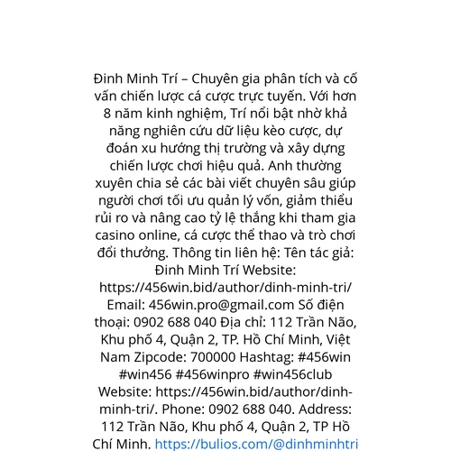 Website: https://456win.bid/author/dinh-minh-tri/. Đinh Minh Trí – Chuyên gia phân tích và cố vấn chiến lược cá cược trực tuyến. Với hơn 8 năm kinh nghiệm, Trí nổi bật nhờ khả năng nghiên cứu dữ liệu kèo cược, dự đoán xu hướng thị trường và xây dựng