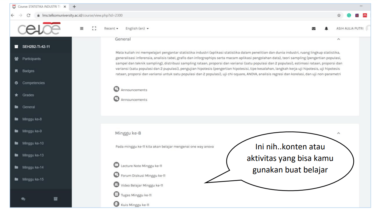 8. Masuk Ke dalam Isi MK (Course) dan selamat mempelajari konten (resource) seperti lecture notes (file), video, atau link eksternal yang disedikan Dosen. Atau bisa juga mengerjakan Activity yang diberikan Dosen seperti Quiz, Forum Diskusi, atau Assignment.