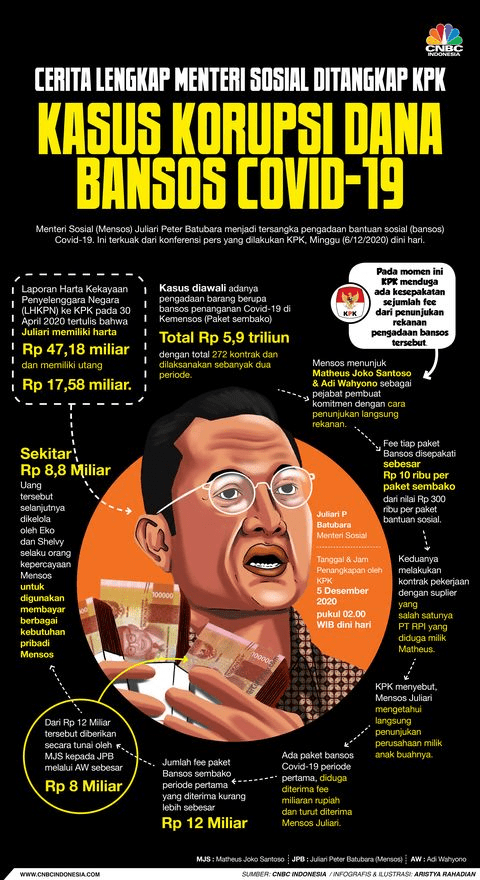 Juliari Batubara tersangkut kasus korupsi, yakni menerima suap sebesar Rp32,4 miliar dari para rekanan penyedia bantuan sosial (bansos) Covid-19 di Kementerian Sosial. Tersangka operasi tangkap tangan (OTT) KPK dalam kasus dugaan suap bantuan sosial (bansos) Covid-19, Matheus Joko Santoso selaku Pejabat Pembuat Komitmen di Kemensos, Ardian IM selaku swasta, dan Harry Sidabuke dihadirkan pada konferensi pers di Kantor KPK, Jakarta Selatan, Minggu (6/12/2020) dini hari. KPK menetapkan lima tersangka termasuk Menteri Sosial, Juliari P Batubara terkait dugaan suap bantuan sosial Covid-19 dan mengamankan total uang sejumlah Rp 14,5 miliar yang terdiri dari mata uang rupiah dan mata uang asing. Rinciannya yakni Rp 11,9 miliar, USD 171.085, dan sekitar SGD 23.000.
