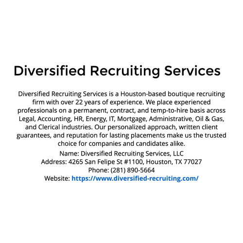 https://www.diversified-recruiting.com/ We connect businesses with top talent and professionals with great careers across Legal, Accounting, IT, HR, Energy, Oil & Gas, and more in Houston.