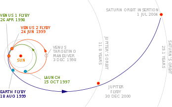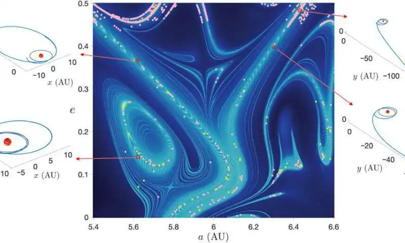 採用動力學模型,其中包含七個主要行星(從金星到海王星)。位於穩定流形上的軌道以較淺的顏色出現,而較暗的區域則對應於其離開的軌跡。